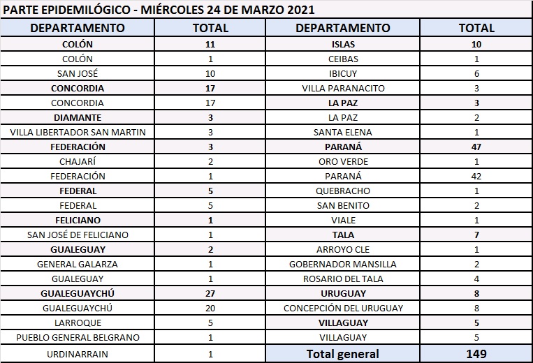 El área de Vigilancia Epidemiológica del Ministerio de Salud, confirmó que en Entre Ríos este miércoles se registraron 149 nuevos casos de coronavirus.
