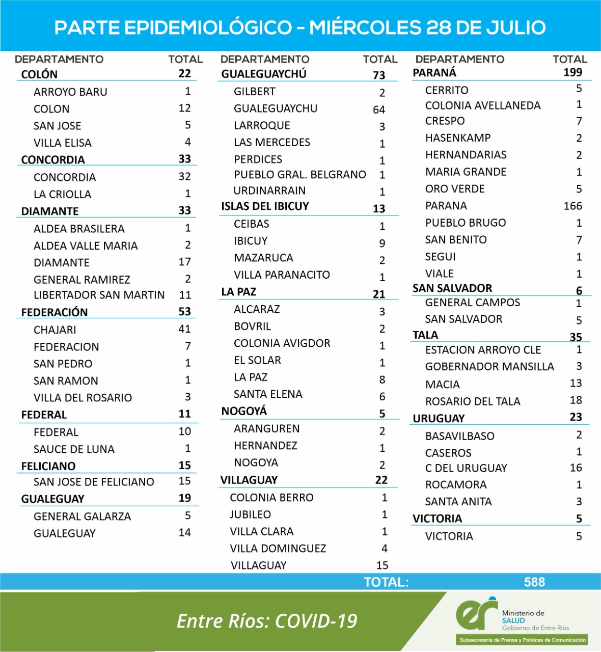 El área de Vigilancia Epidemiológica del Ministerio de Salud, confirmó que en Entre Ríos este miércoles se registraron 588 nuevos casos de coronavirus.