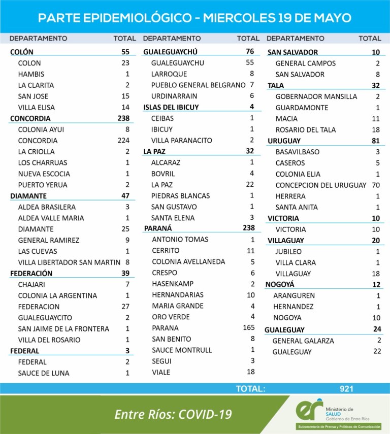 El área de Vigilancias Epidemiológica del Ministerio de Salud, confirmó que en Entre Ríos este miércoles se registraron 921 nuevos casos de coronavirus.