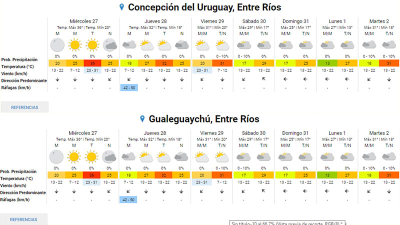 Para el jueves podrían aparecer chaparrones dispersos en áreas de Córdoba y provincias del Cuyo y Noa, producto del intenso calentamiento. Por el momento, en Entre Ríos no se prevén precipitaciones.