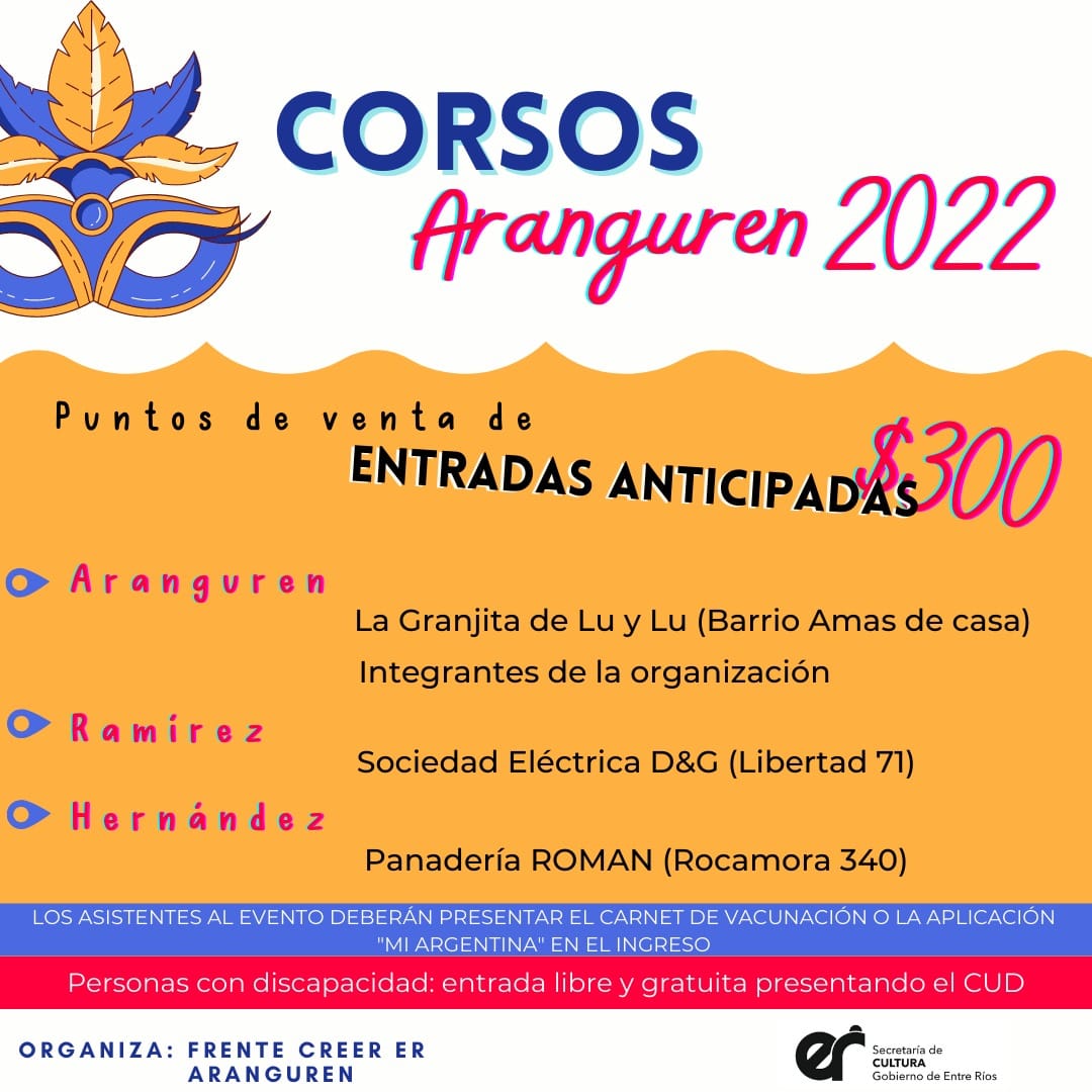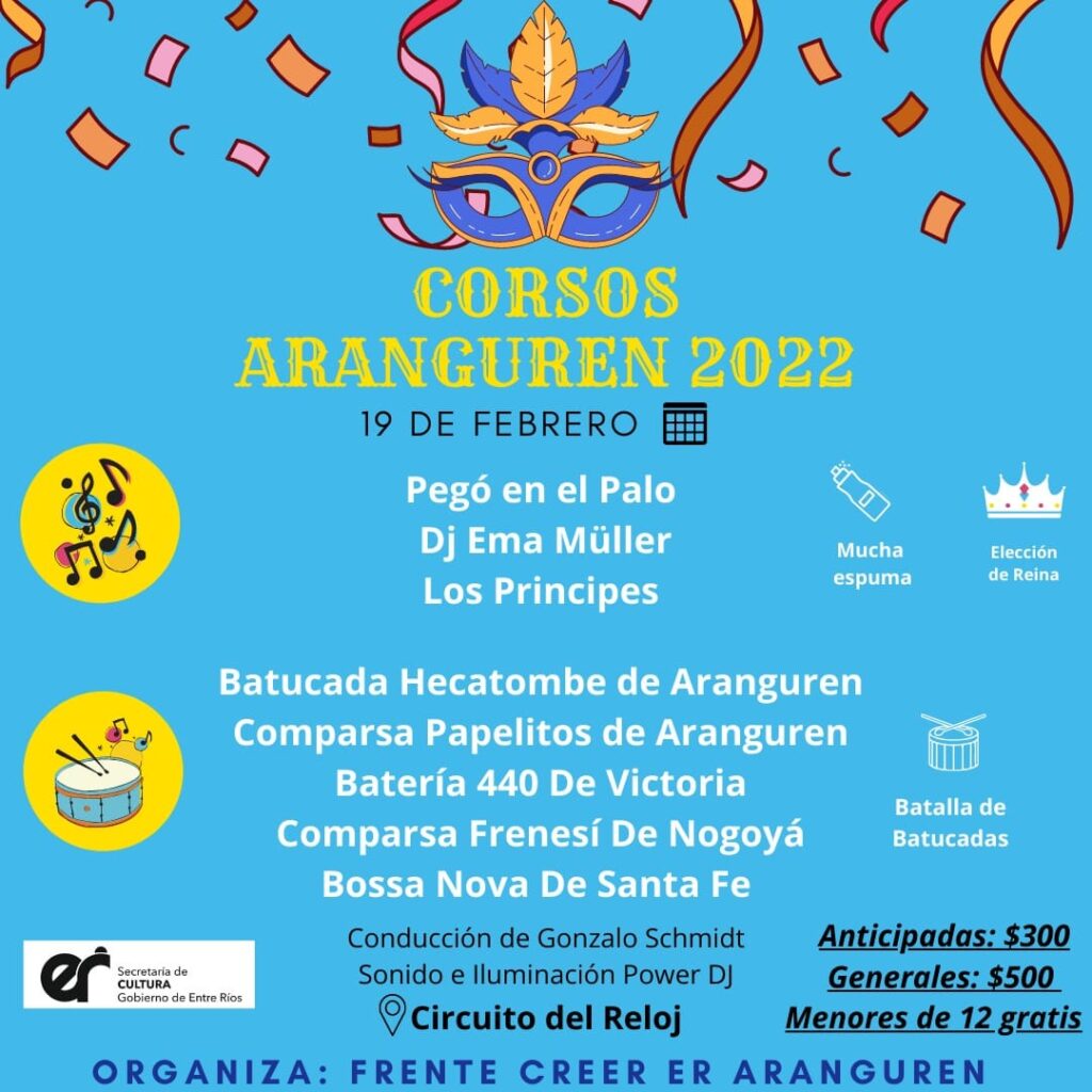 Este sábado 19 de febrero se realizarán los Corsos Aranguren 2022. El espectáculo se desarrollará desde las 21.30, en el Circuito del Reloj, en el corazón de la localidad del departamento Nogoyá.