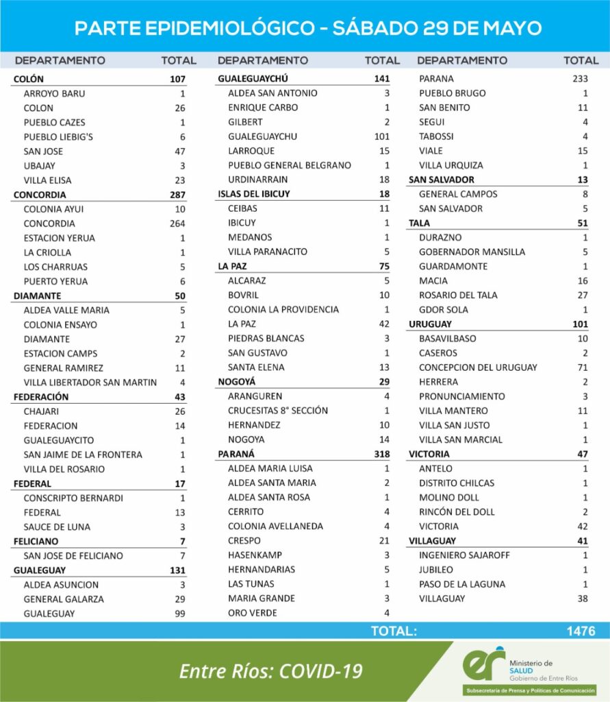 El área de Vigilancia Epidemiológica del Ministerio de Salud, confirmó que en Entre Ríos este sábado se registraron 1476 nuevos casos de coronavirus.