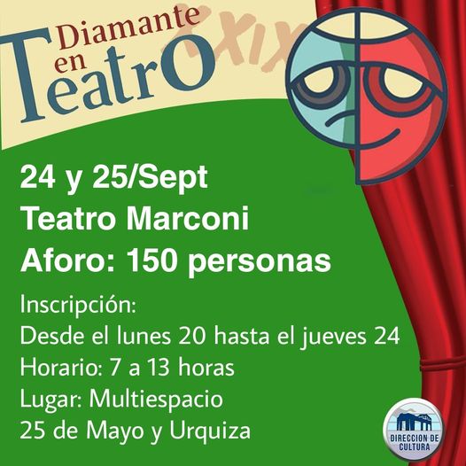 El 24 y 25 de septiembre se desarrollará de manera presencial el 29° Encuentro “Diamante en Teatro”. La actividad es organizada por la Dirección de Cultura Municipal y cuenta con una variada programación y la participación de elencos de Diamante, Paraná, Crespo, Colón, Rosario del Tala y Buenos Aires. También habrá obras del Instituto Nacional del Teatro.