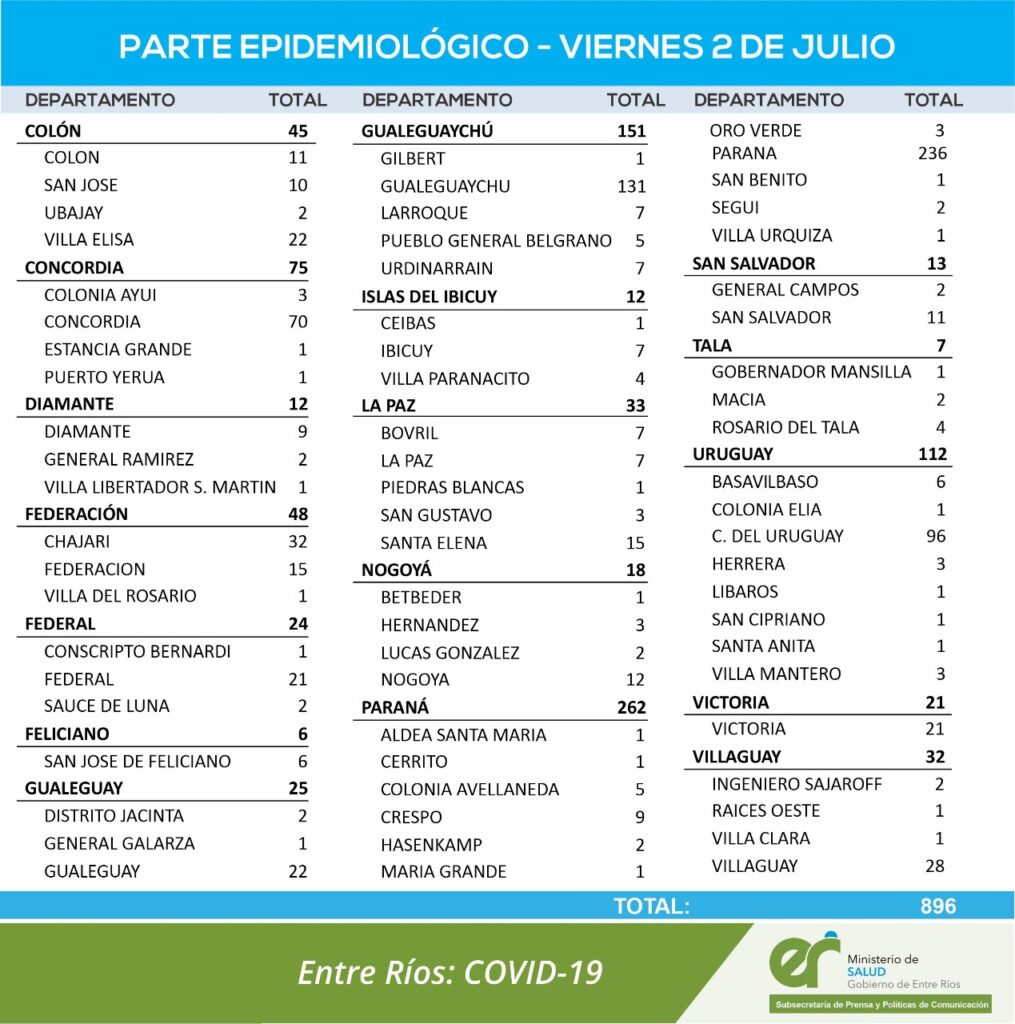 El área de Vigilancia Epidemiológica del Ministerio de Salud, confirmó que en Entre Ríos este viernes se registraron 896 nuevos casos de coronavirus.