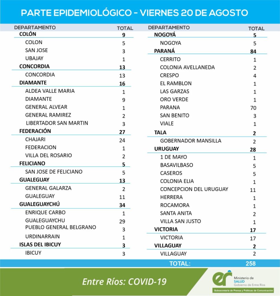 El área de Vigilancia Epidemiológica del Ministerio de Salud confirmó que en Entre Ríos este viernes se registraron 258 nuevos casos de coronavirus.
