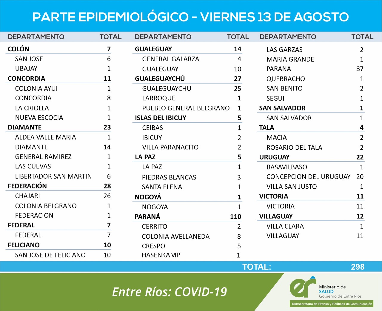 El área de Vigilancia Epidemiológica del Ministerio de Salud, confirmó que en Entre Ríos este viernes se registraron 298 nuevos casos de coronavirus.