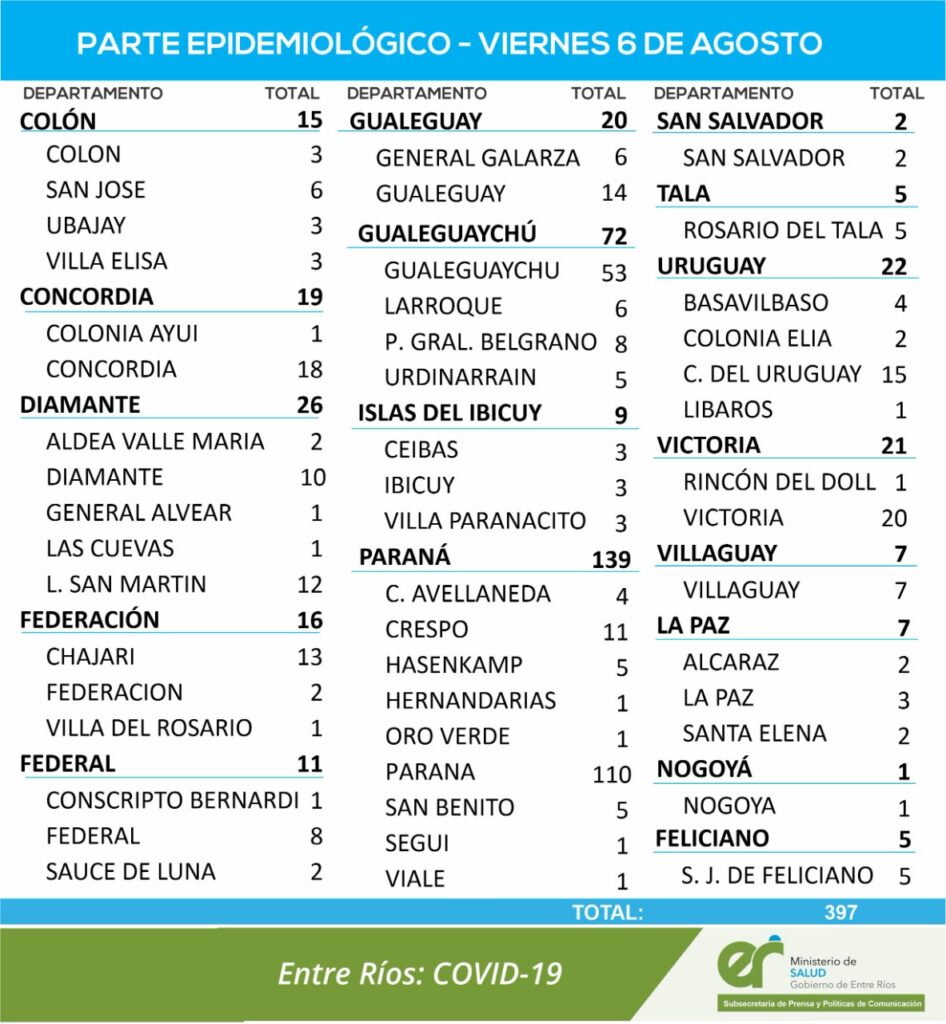 El área de Vigilancia Epidemiológica del Ministerio de Salud, confirmó que en Entre Ríos este viernes se registraron 397 nuevos casos de coronavirus.