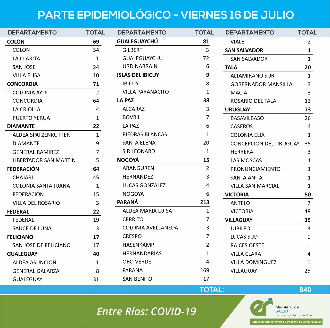 El área de Vigilancia Epidemiológica del Ministerio de Salud, confirmó que en Entre Ríos este viernes se registraron 840 nuevos casos de coronavirus.