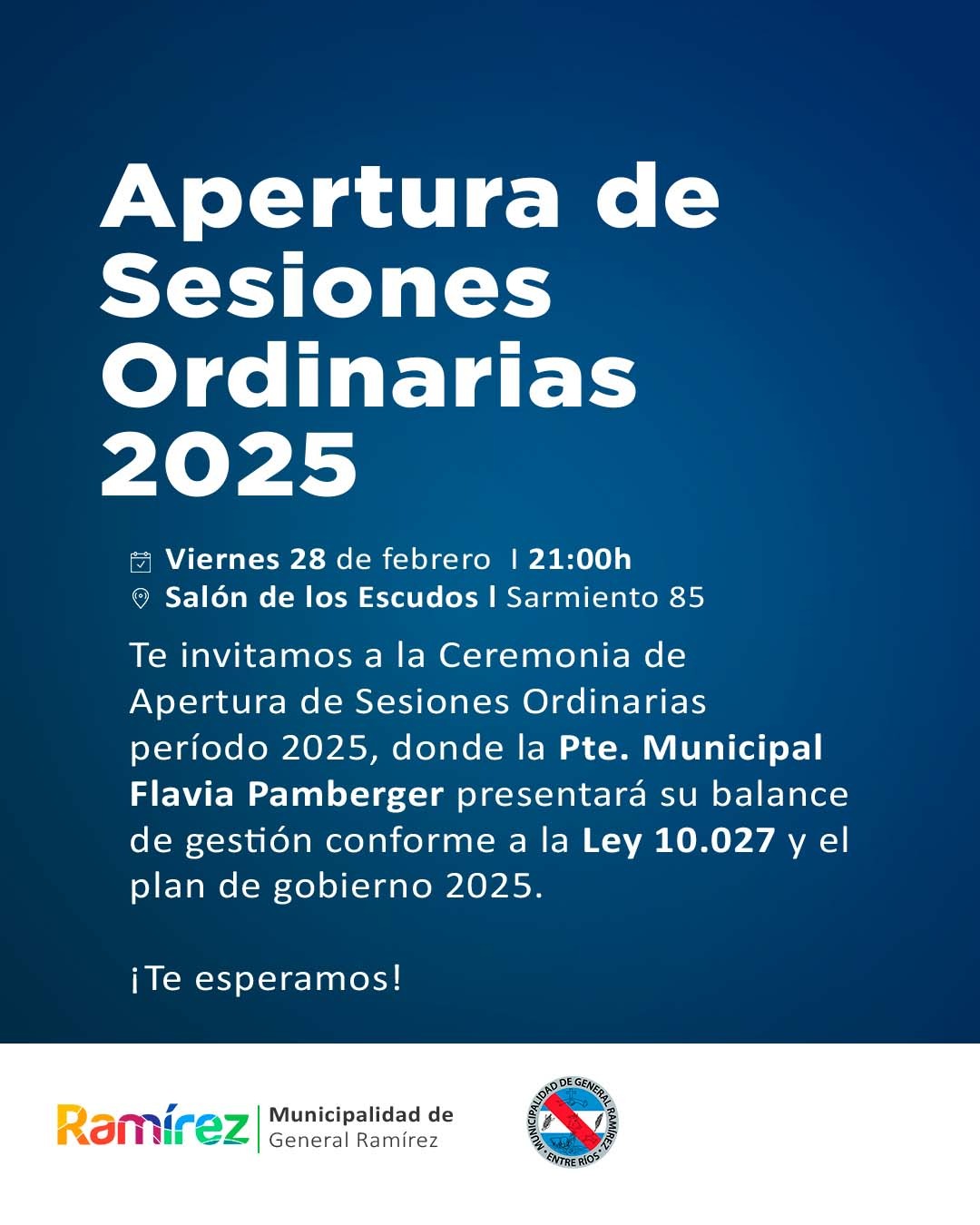 Este viernes 28 de febrero a las 21.00, en el Salón de los Escudos del HCD, la presidente municipal de General Ramírez, Flavia Pamberger encabezará la apertura de sesiones del Concejo Deliberante.