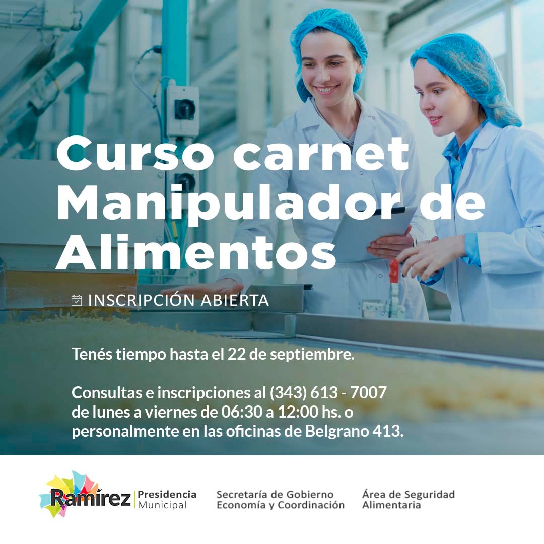 El área de Seguridad Alimentaria, a cargo de la Secretaría de Gobierno de General Ramírez organiza una nueva jornada para acceder al Carnet de Manipulador de Alimentos. Se trata de un documento obligatorio que reemplaza a la Libreta Sanitaria.