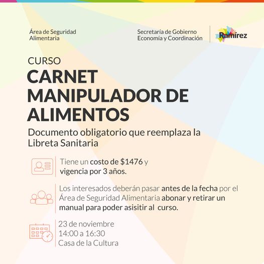 El área de Seguridad Alimentaria de General Ramírez organiza una nueva jornada para acceder al Carnet de Manipulador de Alimentos. Se trata de un documento obligatorio que reemplaza a la Libreta Sanitaria.
