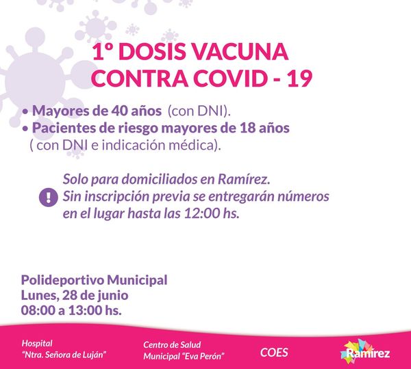 El lunes 28, entre las 08:00 y las 13:00, se aplicarán primeras dosis de la vacuna contra el coronavirus en el Polideportivo Municipal de General Ramírez.