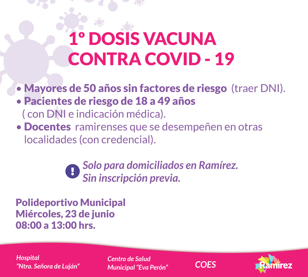 En esta oportunidad la inmunización estará destinada a mayores de 50 años sin factores de riesgo (con DNI), pacientes de riesgo de 18 a 49 años (con DNI e indicación médica) y docentes ramirenses que se desempeñen en otras localidades (con Credencial).