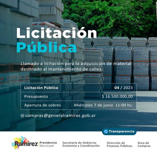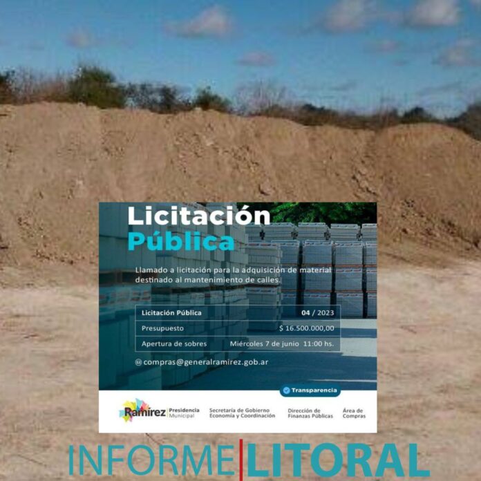 Desde la Municipalidad de General Ramírez llaman a Licitación Pública para la adquisición de material destinado al mantenimiento de calles por $ 16.500.000. La apertura se realizará el miércoles 7 de junio a las 11.
