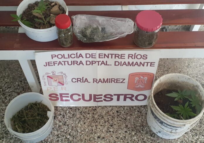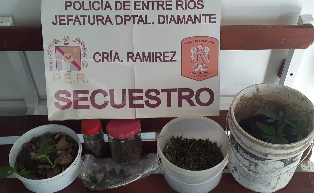 Según expresó a Informe Litoral el segundo jefe de Comisaría Ramírez, subcomisario Martín Figueroa, dentro de la vivienda localizaron «elementos penados por la ley de estupefacientes, siendo recipientes plásticos con cuatro plantines de Cannabis sativa (marihuana); frascos y envoltorios de nylon que contenían derivados procesados de la planta, los cuales fueron debidamente secuestrados con la intervención del personal de Toxicología».