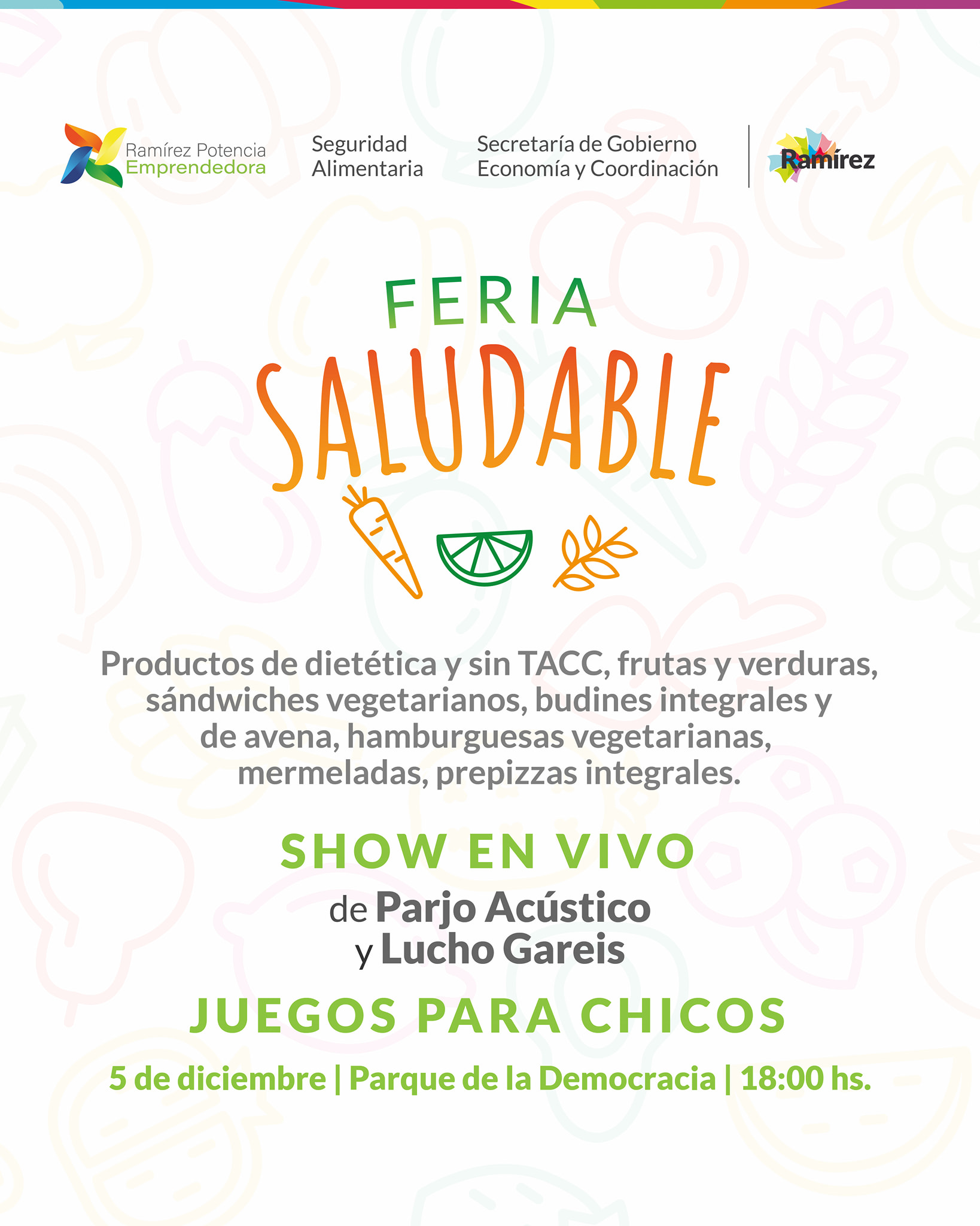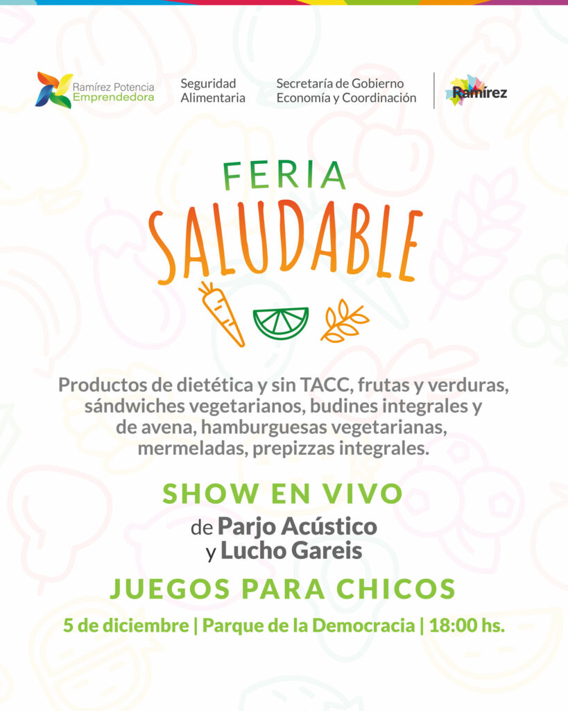 Este domingo 5 de diciembre, se realizará una Feria Saludable, junto a emprendedores de General Ramírez. Será en el Parque de la Democracia, a partir de las 18:00.