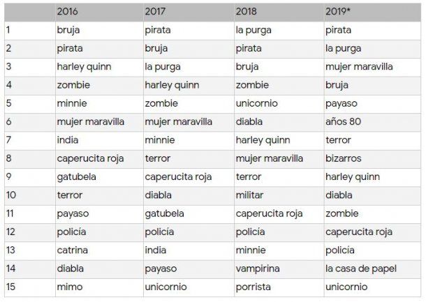 Si bien cada año tiene alguna tendencia destacada, como “años 80” o “la casa de papel” en 2019, hay disfraces que se mantienen arriba en el ranking. Brujas, Piratas, Harley Quinn de DC Comics, Zombie, la Mujer Maravilla o Caperucita Roja son algunos de los más googleados cada año.