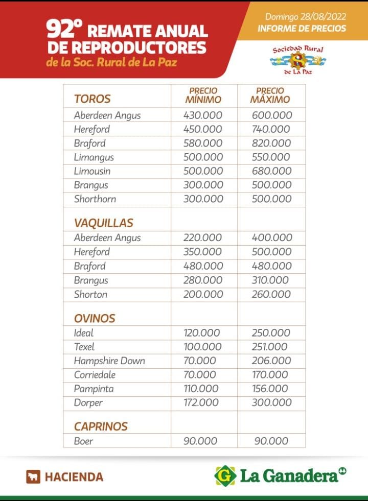 Desde Cooperativa La Ganadera General Ramírez Limitada dieron a conocer el informe de precios del 92º Remate Anual de Reproductores en la Sociedad Rural de La Paz.