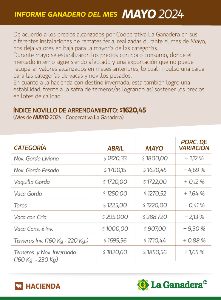 De acuerdo a los precios alcanzados por Cooperativa La Ganadera en sus diferentes instalaciones de remates feria, realizadas durante el mes de mayo, se registraron valores en baja para la mayoría de las categorías.