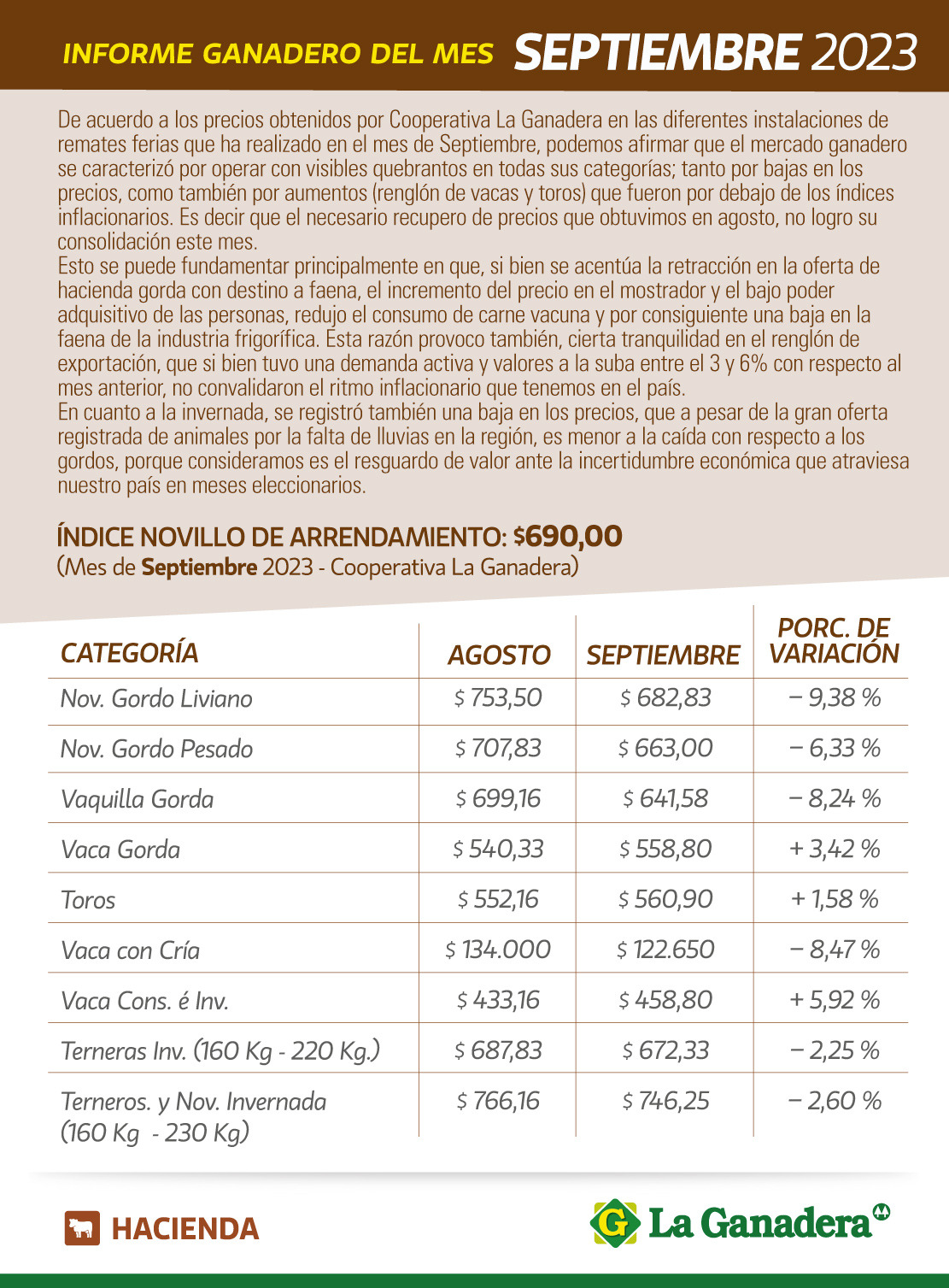 De acuerdo a los precios obtenidos por Cooperativa La Ganadera en las diferentes instalaciones de remates ferias que ha realizado en el mes de septiembre, el mercado ganadero se caracterizó por operar con visibles quebrantos en todas sus categorías; tanto por bajas en los precios, como también por aumentos (renglón de vacas y toros) que fueron por debajo de los índices inflacionarios. Es decir que el necesario recupero de precios obtenido en agosto, no logró su consolidación este mes.