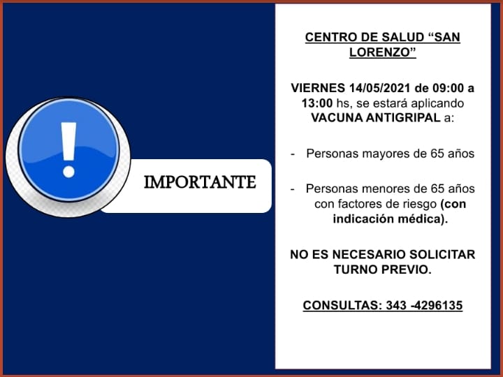 Este viernes 14 de mayo aplicarán la vacuna antigripal de 9 a 13, en el Centro de Salud, San Lorenzo de la localidad de Isletas.