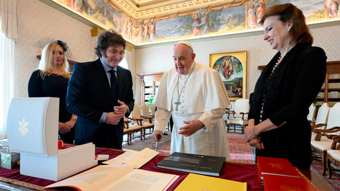 Javier Milei concretó finalmente su esperada reunión con el papa Francisco en el Vaticano. El Presidente estuvo 70 minutos con el Pontífice en un encuentro que tuvo tres tramos. En el primero, el jefe de Estado argentino y el obispo de Roma hablaron a solas; luego ingresó la secretaria general y hermana del mandatario, Karina Milei; y finalmente se sumaron los ministros que formaron parte de la comitiva: Guillermo Francos (Interior), Diana Mondino (Relaciones Exteriores) y Sandra Pettovello (Capital Humano).