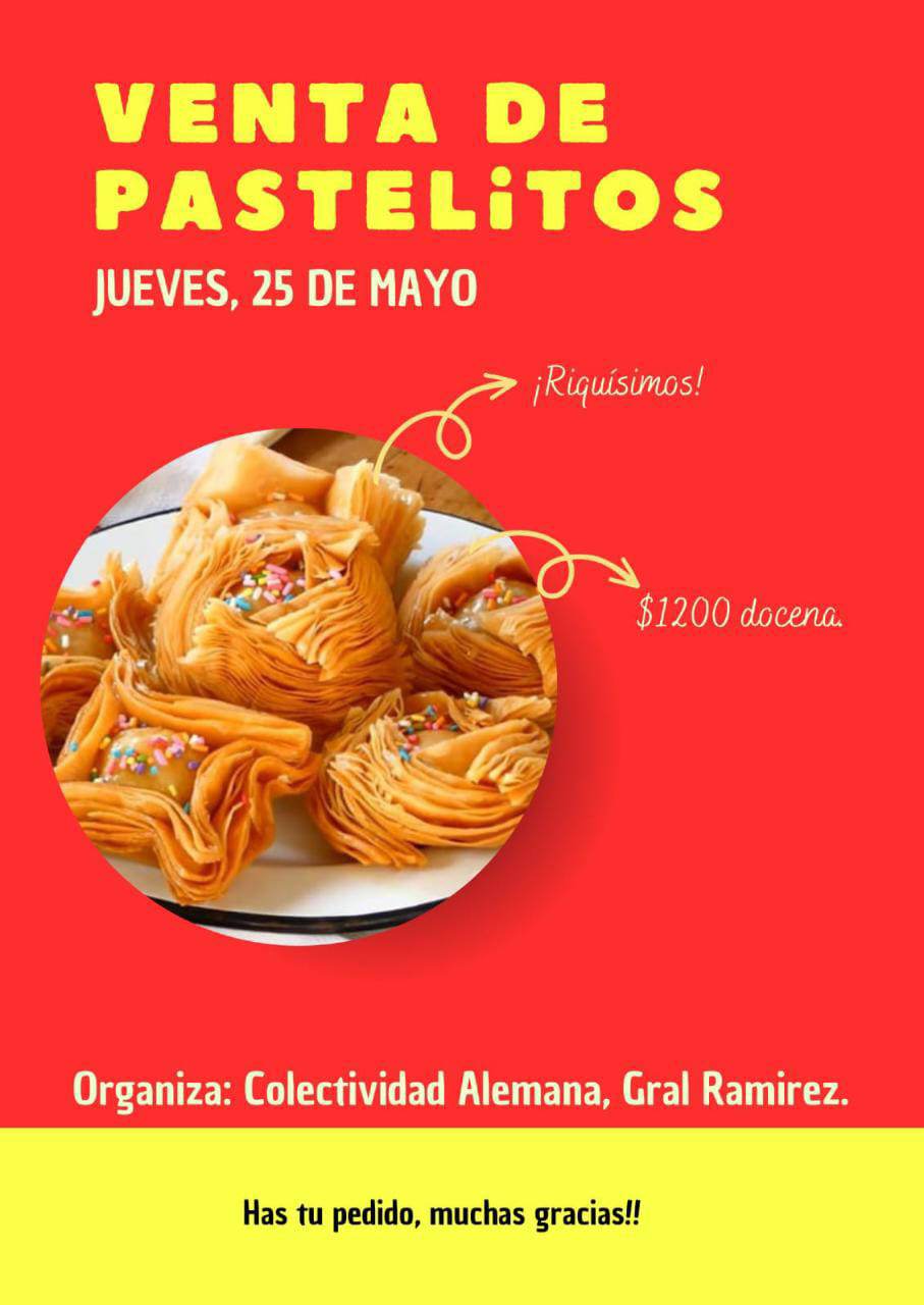 Por otro lado, desde la Colectividad Alemana organizan una venta de pastelitos para este jueves 25 de mayo. La docena sale 1200 pesos. También se pueden hacer pedidos al cel.: 3434647219. (Informe Litoral)