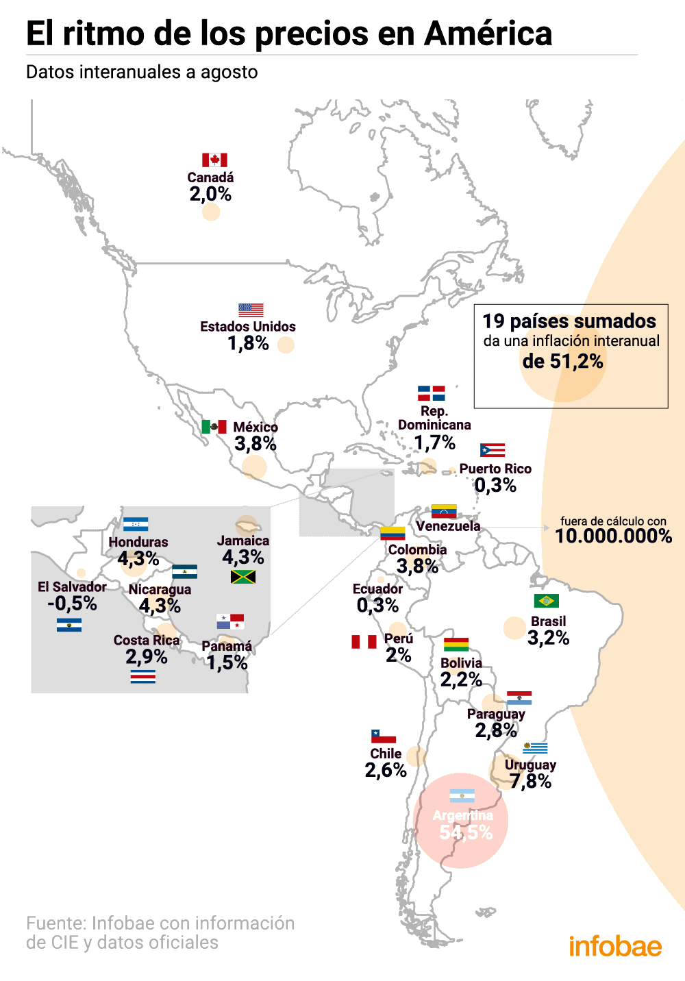 En agosto volvió a manifestarse esa caracterísitca con todo rigor, al punto que la tasa del 4% en el mes volvió a resultar superior a la que registró el promedio en 12 meses en el conjunto de los 19 principales países de América. No se cuenta a Venezuela, que atraviesa por un singular proceso hiperinflacionario que el Fondo Monetario Internacional estimó en sus informes semestrales que se ubica en el rango de 10.000 millones por ciento (5,5% por día), tampoco a Haití, que no tiene estadísticas actualizadas pero es otro país americano con tasa de dos dígitos al año.