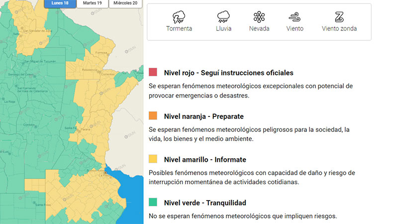 El panorama de humedad e inestabilidad en la mitad norte de la Argentina aun no cambiará para el martes. Según estimó, “podrá haber una mejora temporaria en la primera mitad del día sobre La Pampa, provincia de Buenos Aires y el sur del Litoral, pero las tormentas se presentarían con variada intensidad desde las primeras horas en el NOA, Córdoba y parte del noreste argentino, y retornarían hacia el sur durante el día, volviendo afectar distintos puntos de la región Pampeana”.