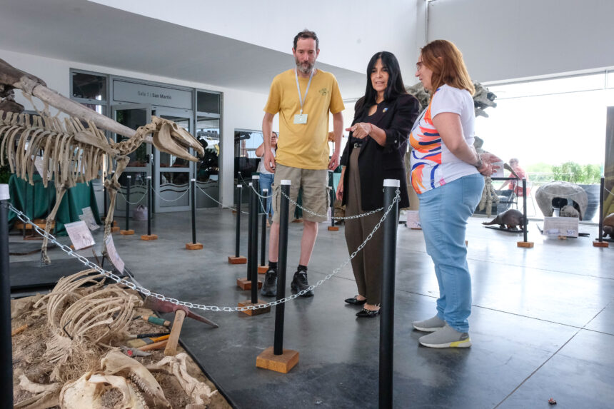 La vicegobernadora Aluani fue recibida este jueves por la presidenta de la Asociación Paleontológica Argentina (APA), Julia Desojo; y la presidenta de la Comisión Organizadora Delegación Entre Ríos, Mariana Brea. De la actividad también participó el secretario de la Honorable Cámara de Senadores de Entre Ríos, Sergio Avero. En la oportunidad, recorrieron dos espacios: Paleoarte, con obras de destacados artistas y Megafauna Cuaternario de Entre Ríos. Ambas muestras son organizadas conjuntamente con el Museo Serrano y el Museo Provincial de la Imagen de Concordia.