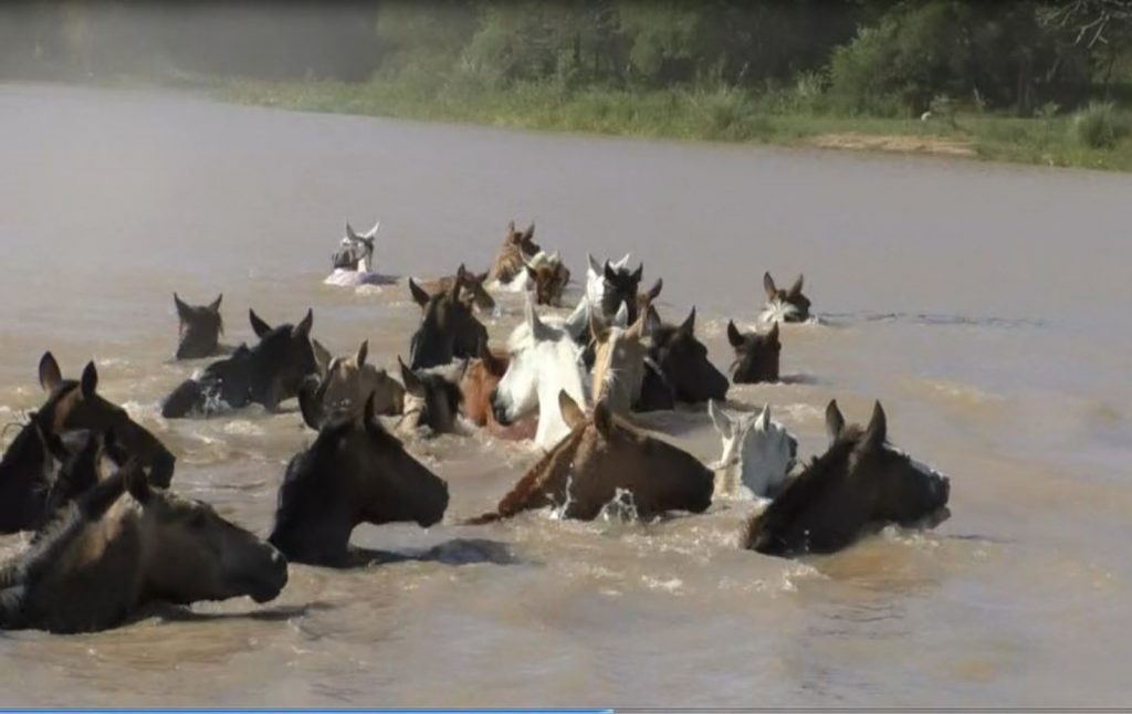 El azote consiste en cruzar la tropilla por el río, de un extremo al otro, los animales van guiados por uno o dos hombres montados a caballo.