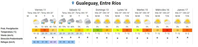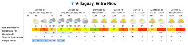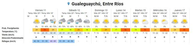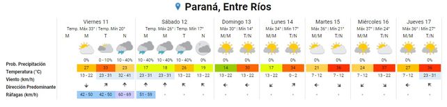 El Servicio Meteorológico Nacional pronostica un cielo parcialmente nublado durante la mañana y tarde de este viernes en la costa del Paraná y centro de la provincia, donde las lluvias aisladas llegarían a la noche. La temperatura de la jornada, que será calurosa, se ubicará en promedio entre 20° de mínima 33° de máxima. Se esperan vientos fuertes, con ráfagas de hasta 69 kilómetros por hora.