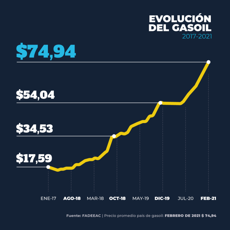 En segundo lugar, el gasoil aumentó un 4,45%, el séptimo ajuste consecutivo desde agosto, tanto en el segmento mayorista como el minorista. Con esta suba, “el aumento promedio de este insumo central para el funcionamiento del sector alcanzó casi el 40% en los últimos doce meses, tras haberse incrementado 45,5% en 2019 y 77% en 2018″, detalló la Federación.