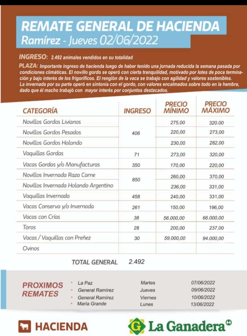 Desde Cooperativa La Ganadera de General Ramírez dieron a conocer los valores mínimos y máximos que se obtuvieron en el remate general de hacienda del jueves 2 de junio en el predio ferial de General Ramírez. En total ingresaron 2492 animales que fueron vendidos en su totalidad.