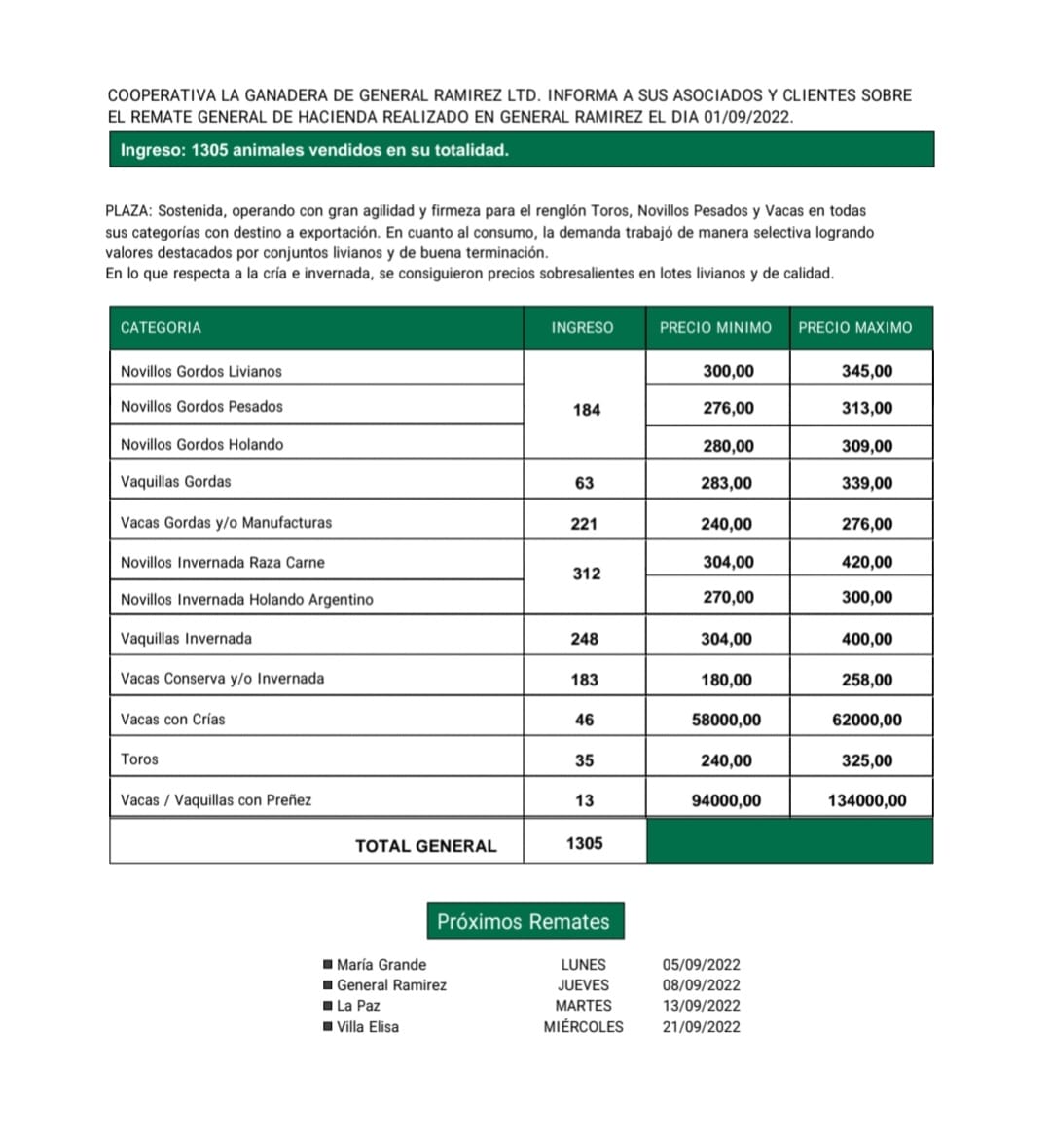 Desde Cooperativa La Ganadera de General Ramírez dieron a conocer los valores mínimos y máximos que se obtuvieron en el remate general de hacienda del jueves 1 de septiembre en el predio ferial de General Ramírez. En total ingresaron 1305 animales que fueron vendidos en su totalidad.