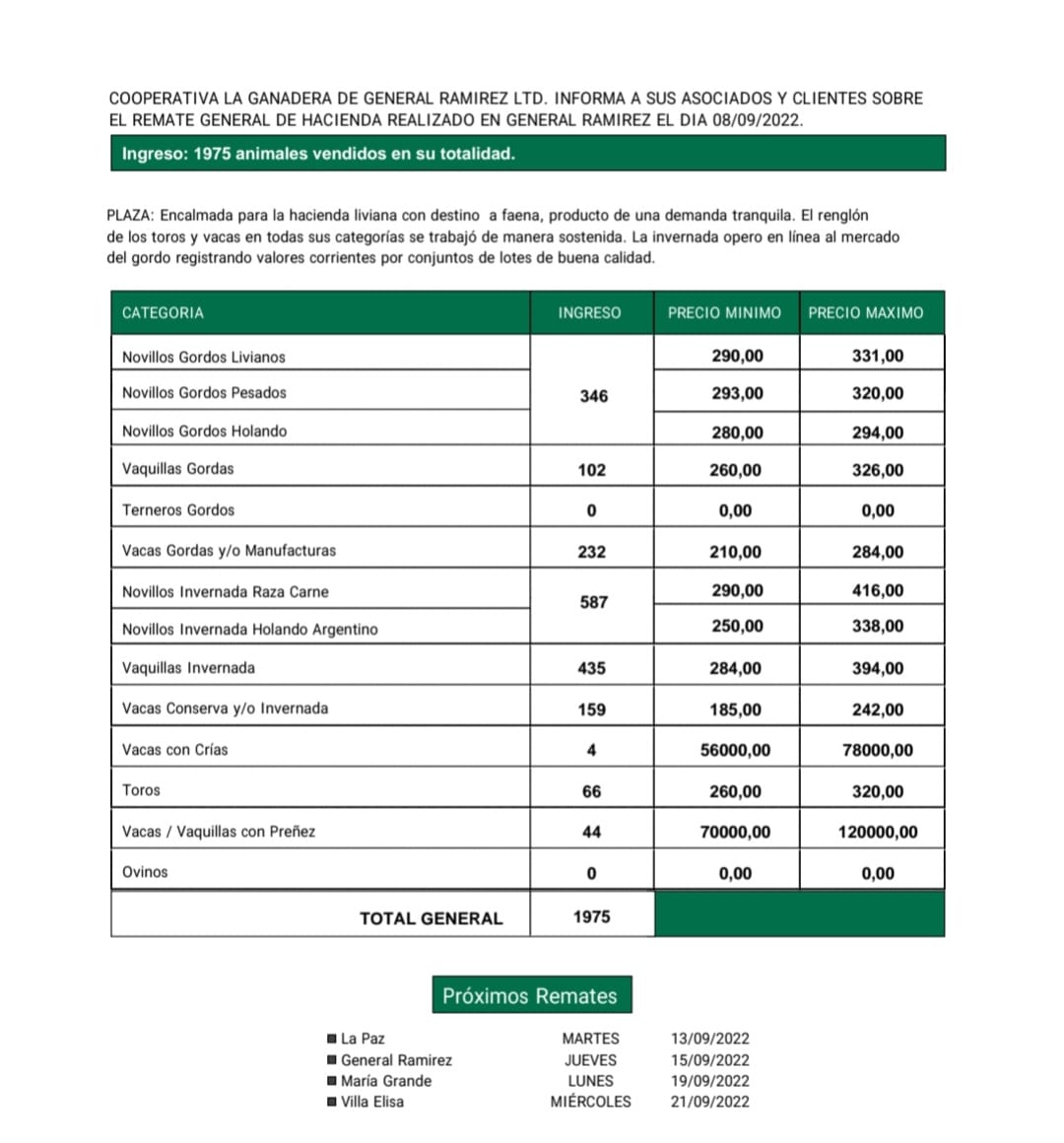 Desde Cooperativa La Ganadera de General Ramírez dieron a conocer los valores mínimos y máximos que se obtuvieron en el remate general de hacienda del jueves 8 de septiembre en el predio ferial de General Ramírez. En total ingresaron 1975 animales que fueron vendidos en su totalidad.