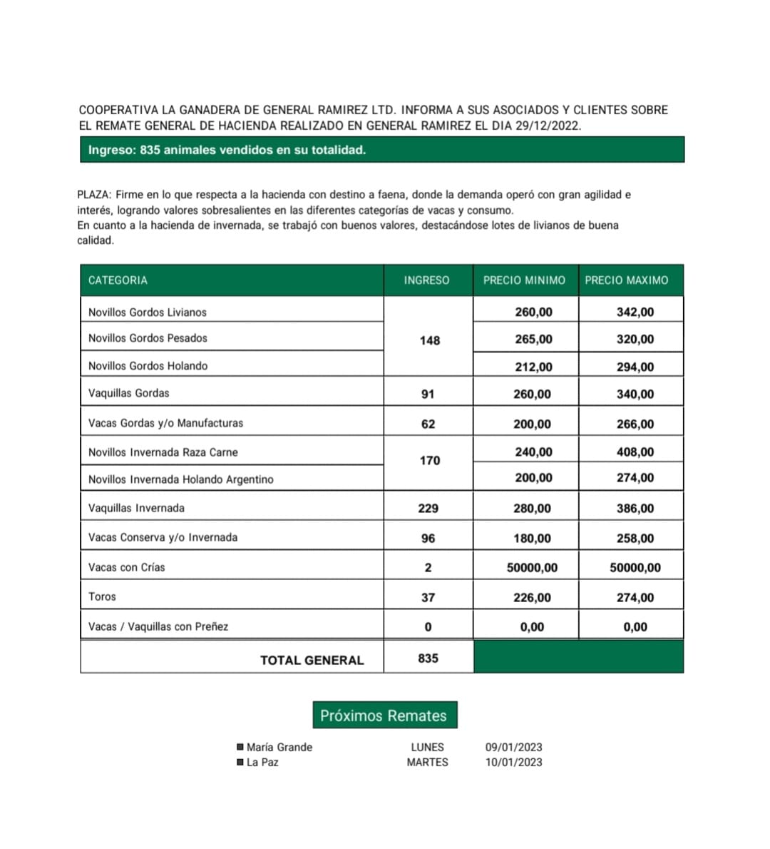 Desde Cooperativa La Ganadera de General Ramírez dieron a conocer los valores mínimos y máximos que se obtuvieron en el remate general de hacienda del jueves 29 de diciembre en el predio ferial de General Ramírez. En total ingresaron 835 animales que fueron vendidos en su totalidad.