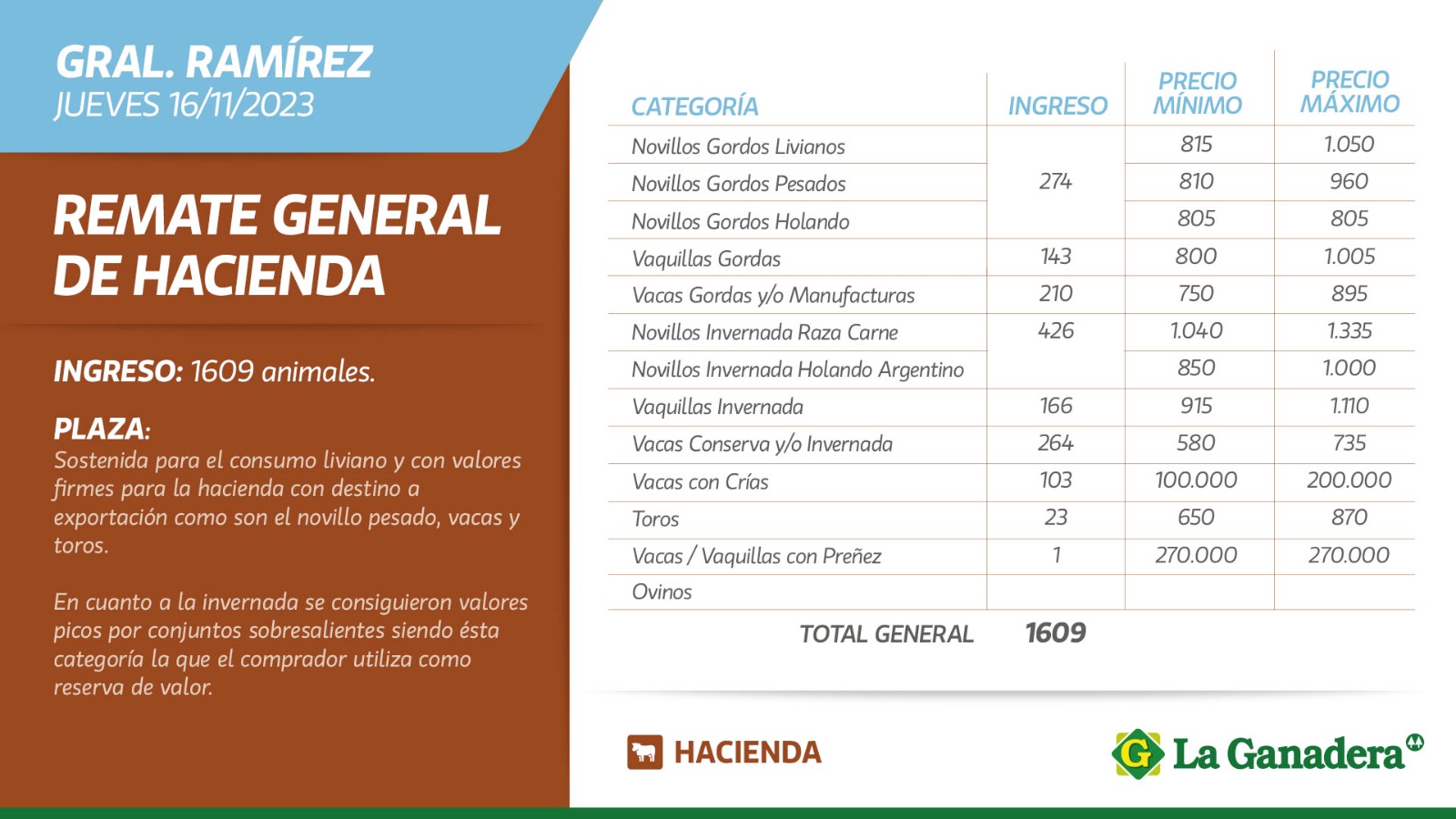 Desde Cooperativa La Ganadera de General Ramírez dieron a conocer los valores mínimos y máximos que se obtuvieron en el remate general de hacienda del jueves 16 de noviembre de 2023 en el predio ferial de General Ramírez. En total ingresaron 1609 animales.