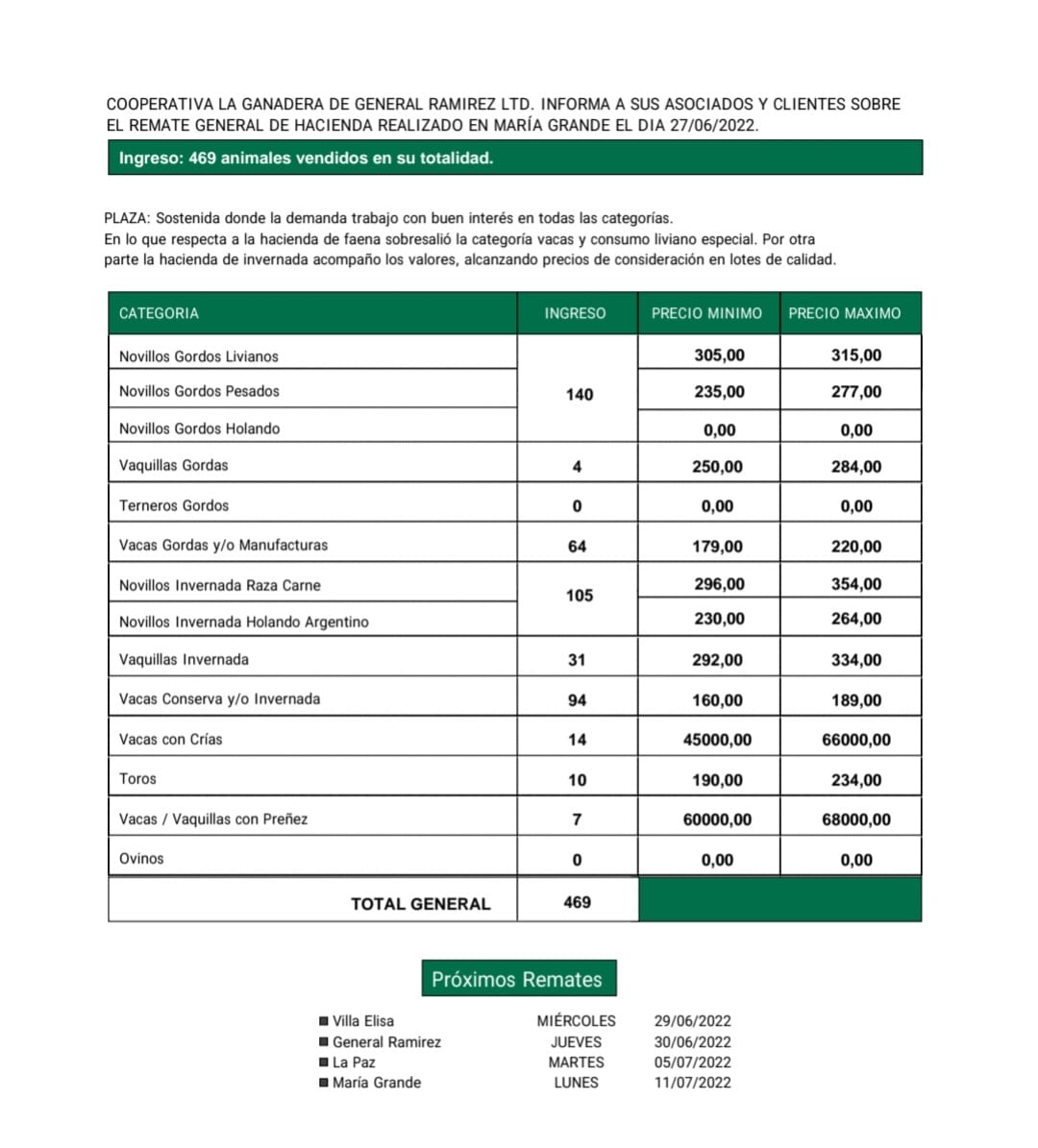 Desde Cooperativa La Ganadera de General Ramírez dieron a conocer los valores mínimos y máximos que se obtuvieron en el remate general de hacienda del lunes 27 de junio en el predio ferial de María Grande. En total ingresaron 469 animales que fueron vendidos en su totalidad.