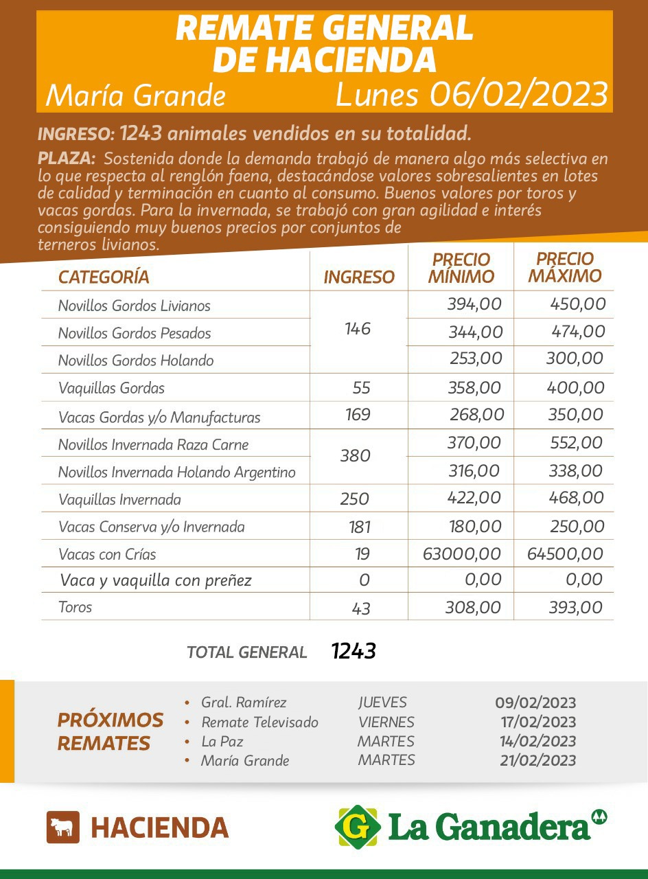 Desde Cooperativa La Ganadera de General Ramírez dieron a conocer los valores mínimos y máximos que se obtuvieron en el remate general de hacienda del lunes 06 de febrero de 2023 en el predio ferial de María Grande. En total ingresaron 1243 animales que fueron vendidos en su totalidad.