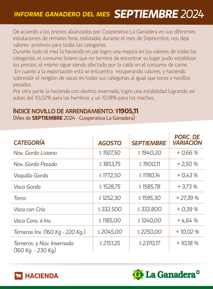 De acuerdo a los precios alcanzados por Cooperativa La Ganadera en sus diferentes instalaciones de remates feria, realizadas durante el mes de septiembre, hubo valores positivos para todas las categorías.