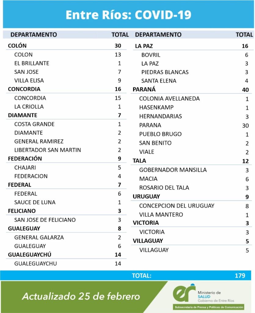 El área de Vigilancia Epidemiológica del Ministerio de Salud, confirmó que en Entre Ríos este jueves se registraron 179 nuevos casos de coronavirus.