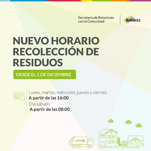 A partir del 1º de diciembre rige un nuevo horario de recolección de residuos en General Ramírez. Desde esa fecha el día sábado la recolección se realiza por la mañana.