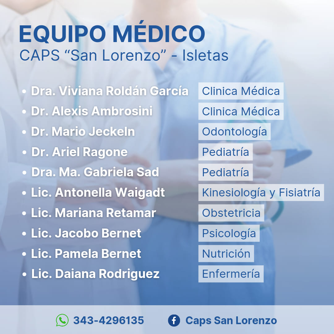 Desde el Centro de Atención Primaria de la Salud, San Lorenzo de Isletas, dieron a conocer la grilla con el equipo médico que brinda atención en el nosocomio. Son un total de 10 profesionales que brindan ocho especialidades.