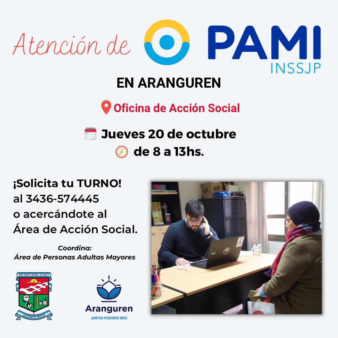Este jueves 20 de octubre el Instituto Nacional de Servicios Sociales para Jubilados y Pensionados –PAMI– atenderá en la localidad de Aranguren. Será de 8 a 13 en la oficina de Acción Social de la Municipalidad.