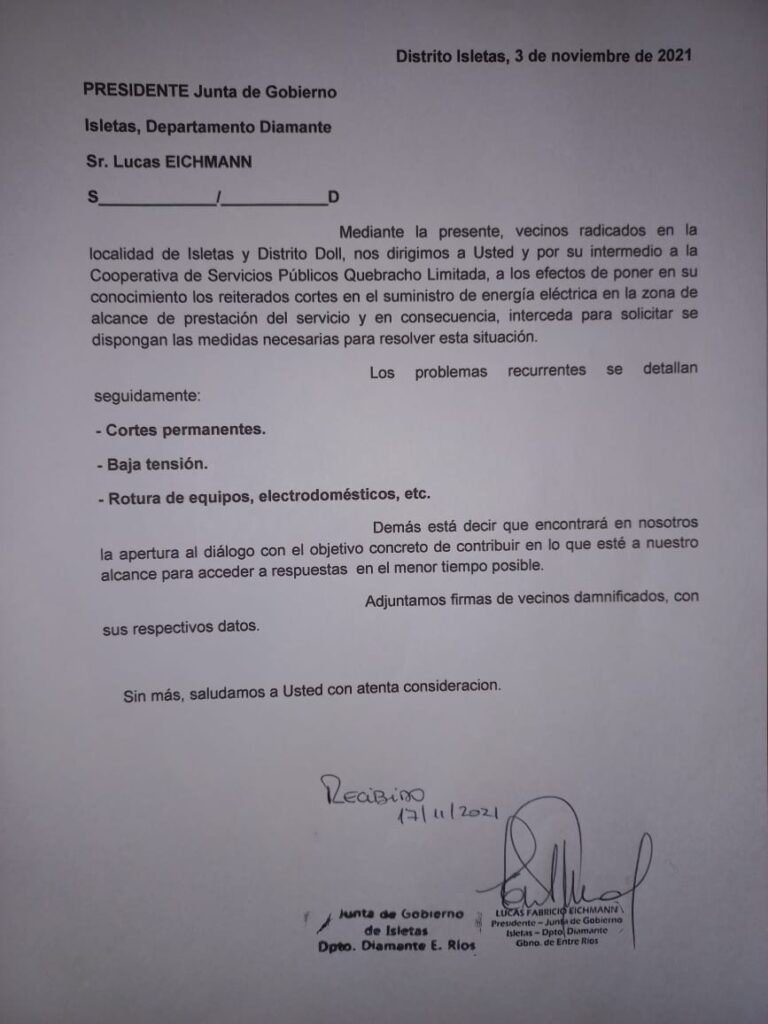 Cansados de los inconvenientes con el suministro de energía eléctrica, un grupo de vecinos de la localidad de Isletas y Distrito Doll en el departamento Diamante, elevaron un reclamo ante la Junta de Gobierno.