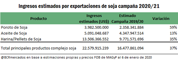 Según el último informe de la Bolsa de Comercio de Rosario “la revalorización en los precios de los productos del principal complejo exportador de nuestro país podría elevar el ingreso de divisas por su exportación en un 37%, según precios FOB oficiales al día miércoles 6 de enero“.
