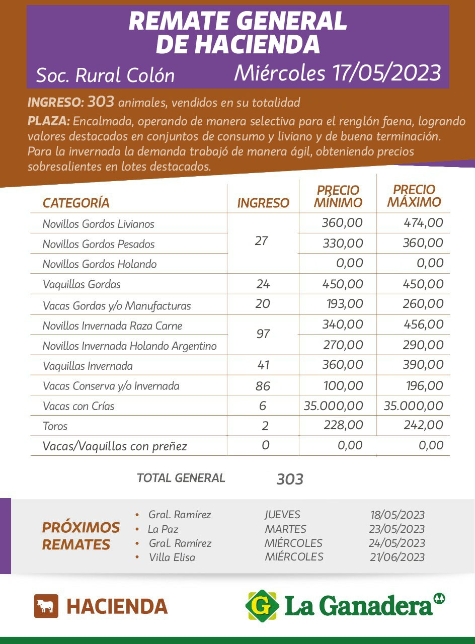 Desde Cooperativa La Ganadera de General Ramírez dieron a conocer los valores mínimos y máximos que se obtuvieron en el remate general de hacienda del miércoles 17 de mayo en el predio de la Sociedad Rural de Colón. En total ingresaron 303 animales que fueron vendidos en su totalidad.