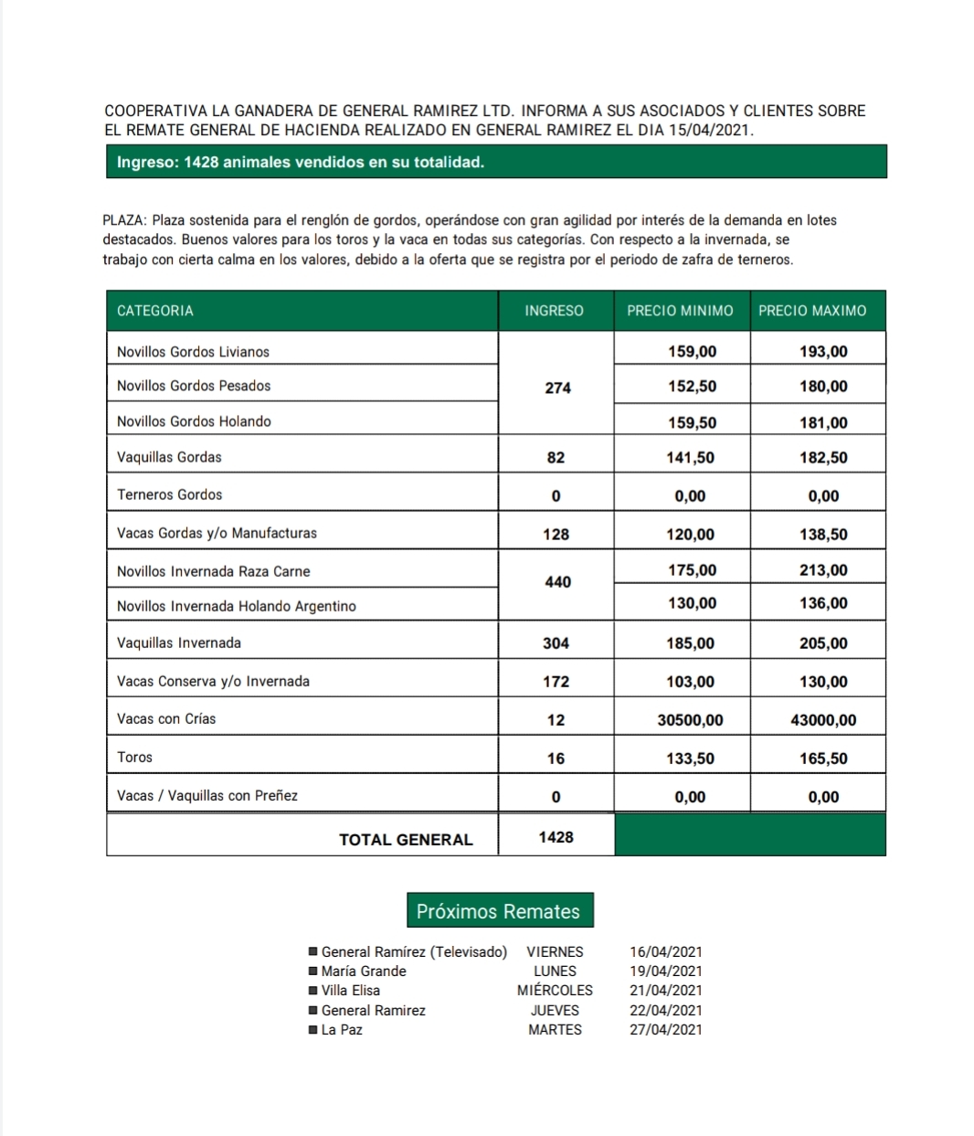 Desde Cooperativa La Ganadera de General Ramírez dieron a conocer los valores mínimos y máximos que se obtuvieron en el remate general de hacienda del jueves 15 de abril en el predio ferial de General Ramírez. En total ingresaron 1428 animales que fueron vendidos en su totalidad.
