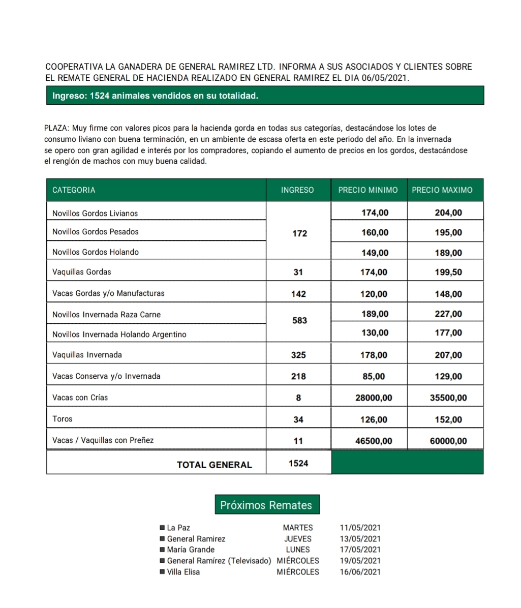 Desde Cooperativa La Ganadera de General Ramírez dieron a conocer los valores mínimos y máximos que se obtuvieron en el remate general de hacienda del jueves 06 de mayo en el predio ferial de General Ramírez. En total ingresaron 1524 animales que fueron vendidos en su totalidad.